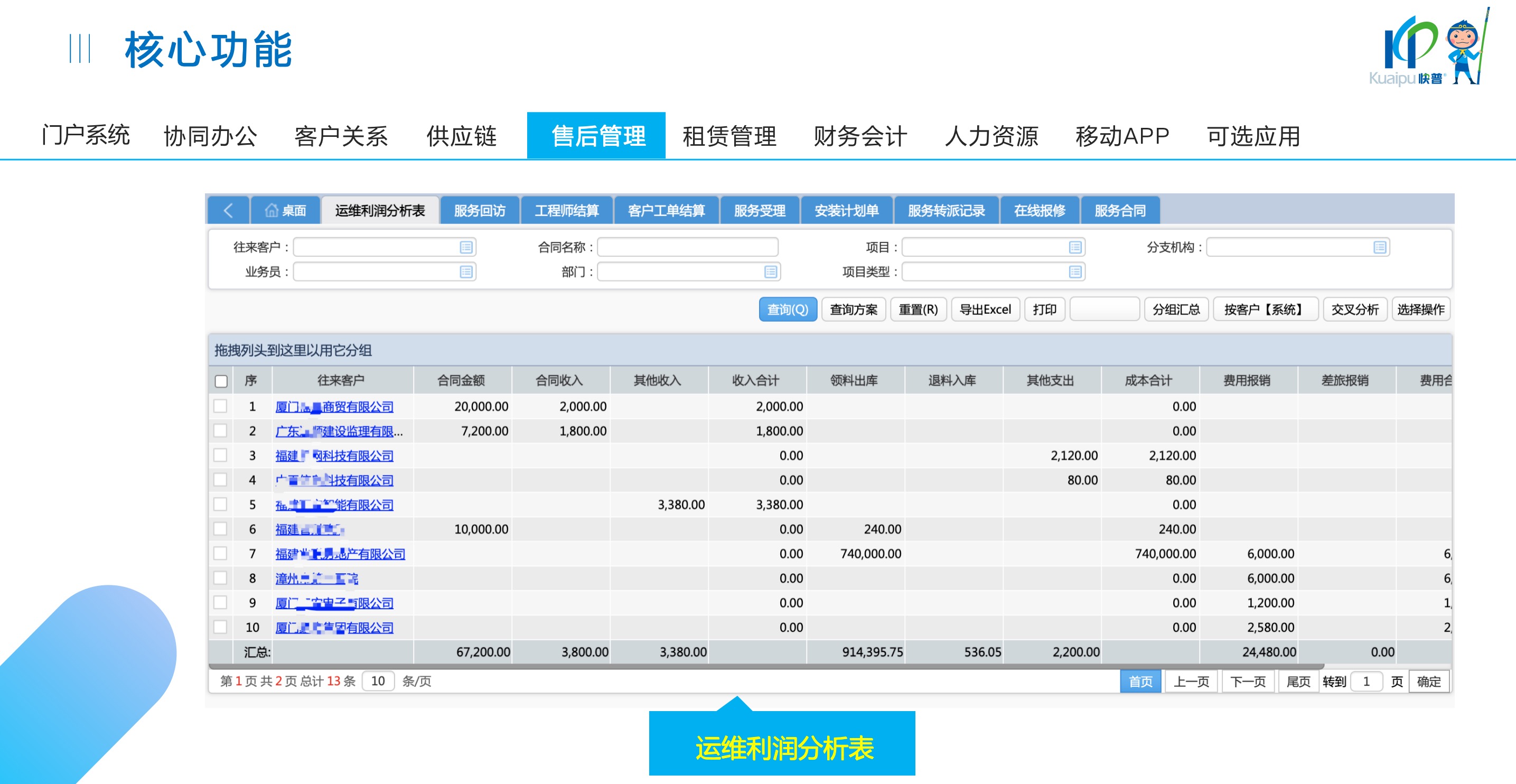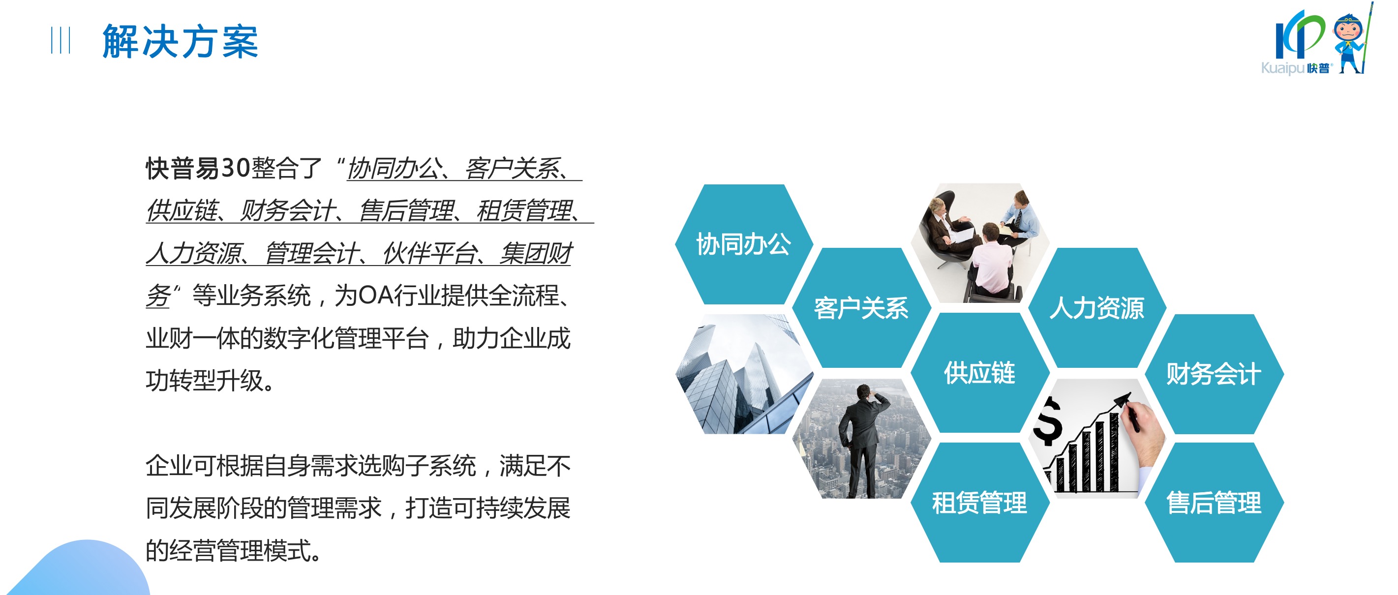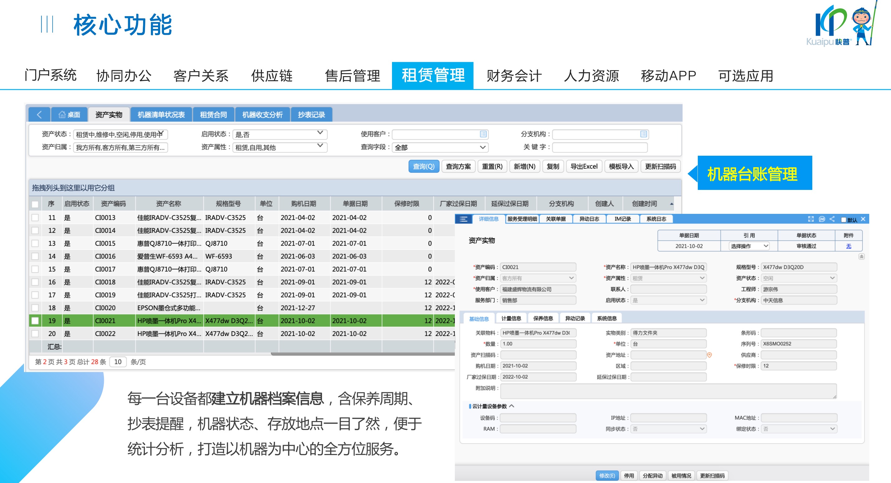 快普易30基于快普近20年在全國上萬家OA企業(yè)的實施與服務(wù)經(jīng)驗,融合了行業(yè)成功的管理智慧,以“客戶+機器”為中心提供數(shù)字化轉(zhuǎn)型解決方案,全面解決銷售、服務(wù)、租賃等多種業(yè)務(wù)模式的管理需求,以及企業(yè)經(jīng)營核算分析。