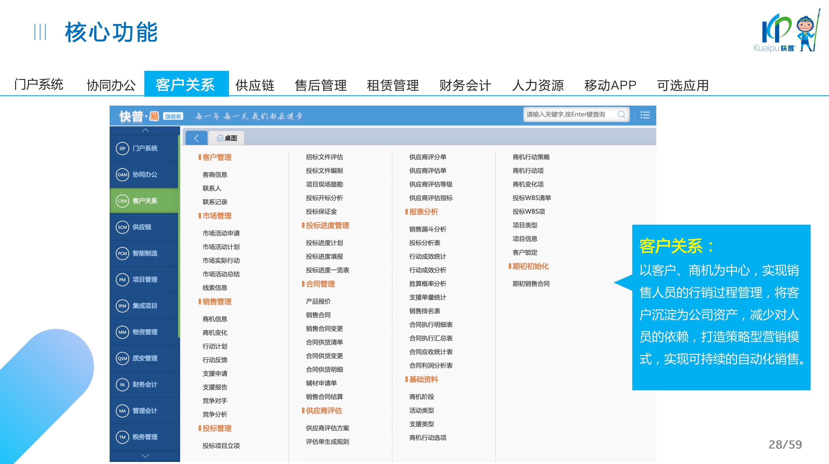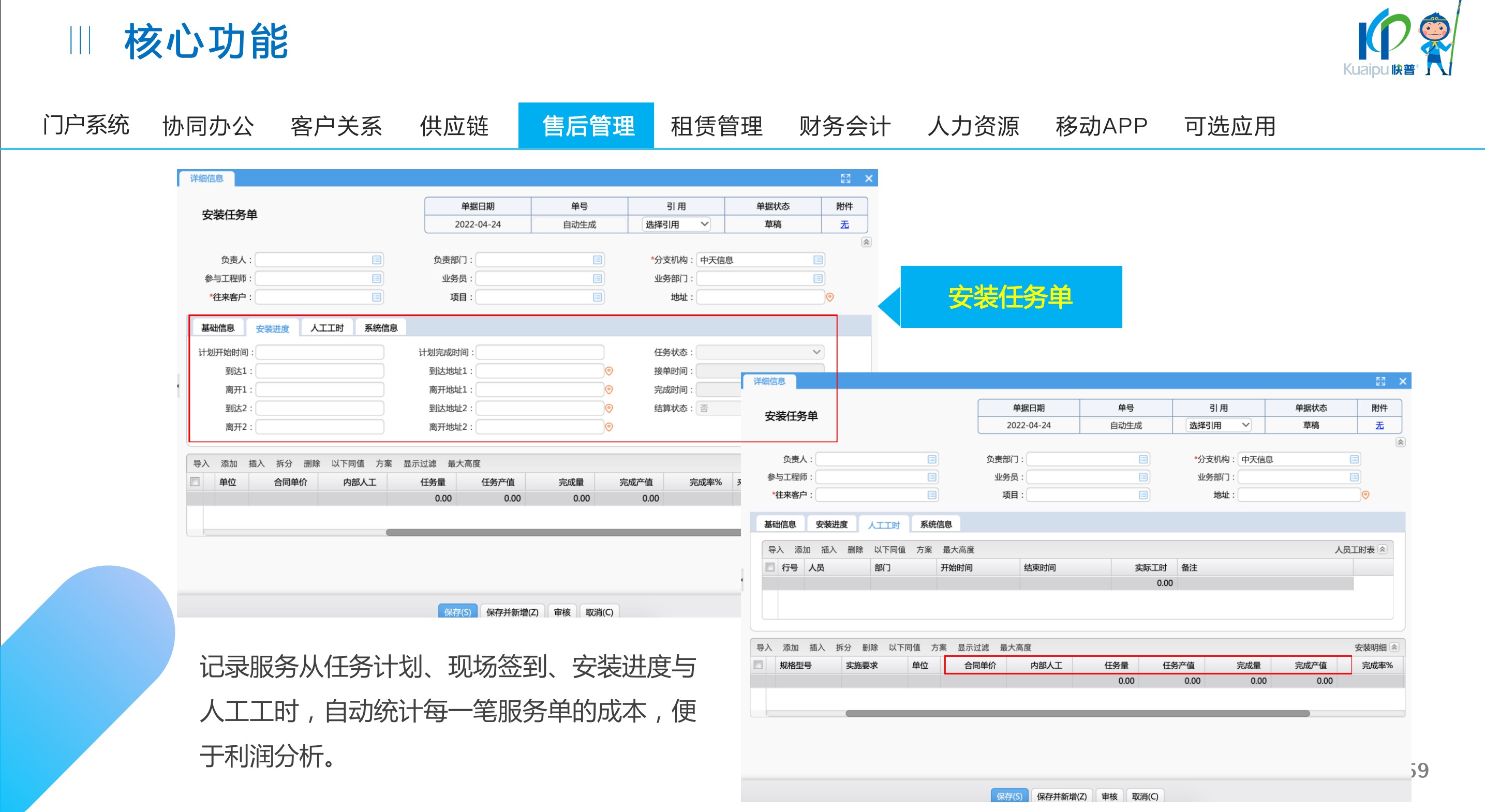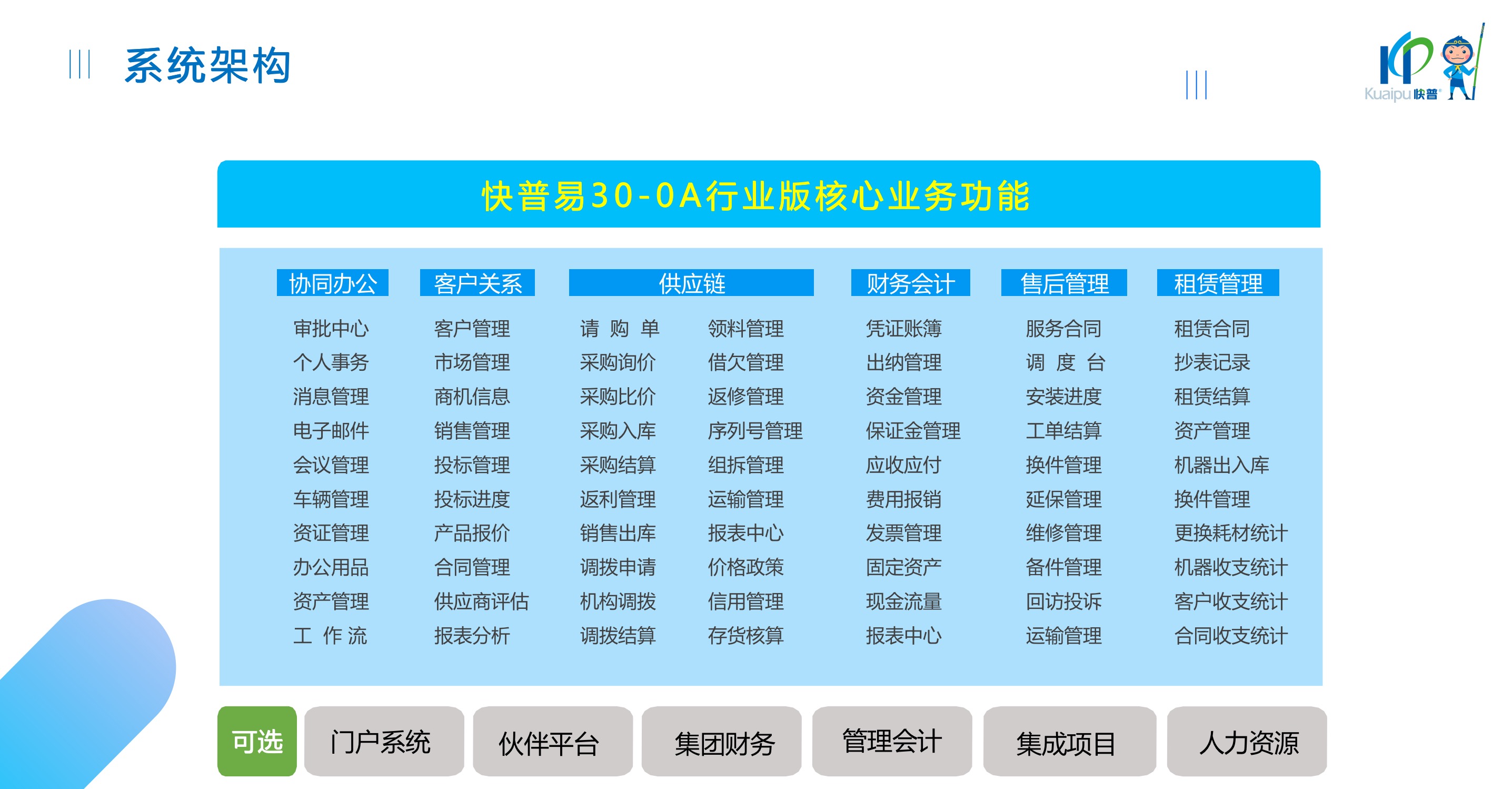 快普易30基于快普近20年在全國上萬家OA企業(yè)的實施與服務(wù)經(jīng)驗,融合了行業(yè)成功的管理智慧,以“客戶+機器”為中心提供數(shù)字化轉(zhuǎn)型解決方案,全面解決銷售、服務(wù)、租賃等多種業(yè)務(wù)模式的管理需求,以及企業(yè)經(jīng)營核算分析。