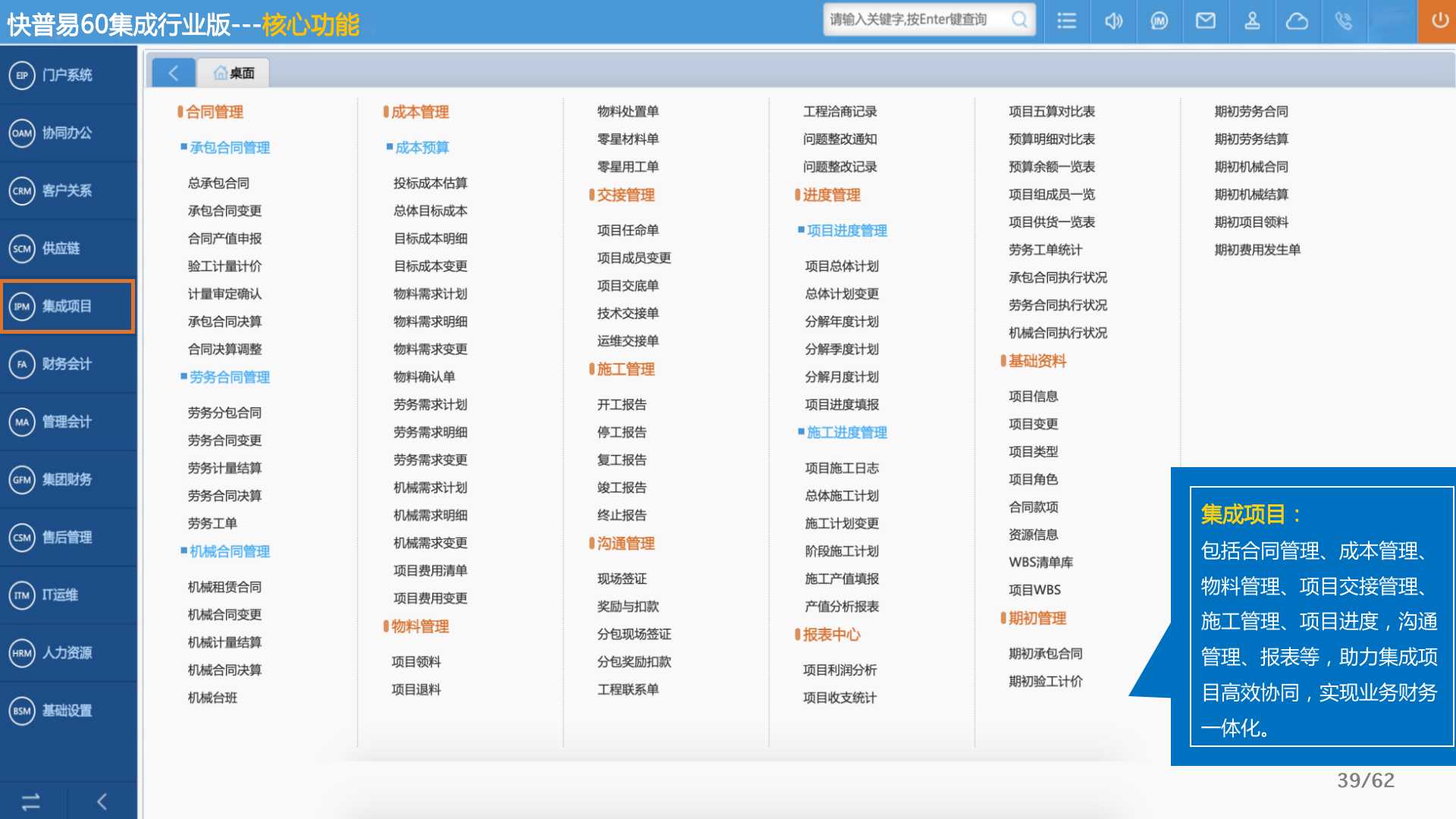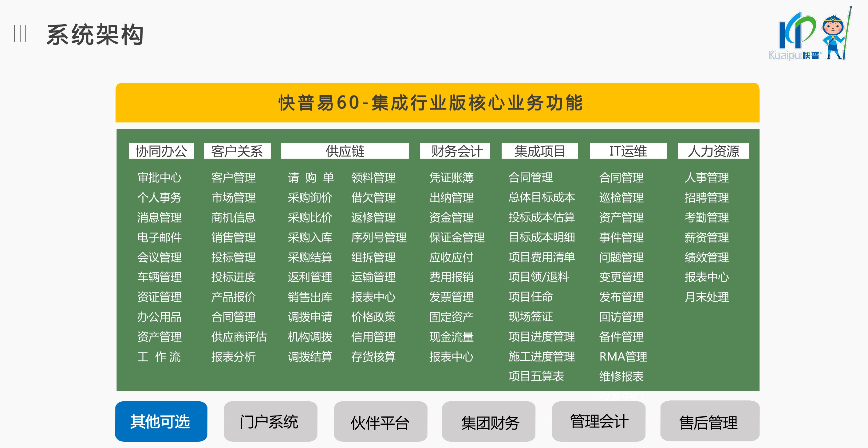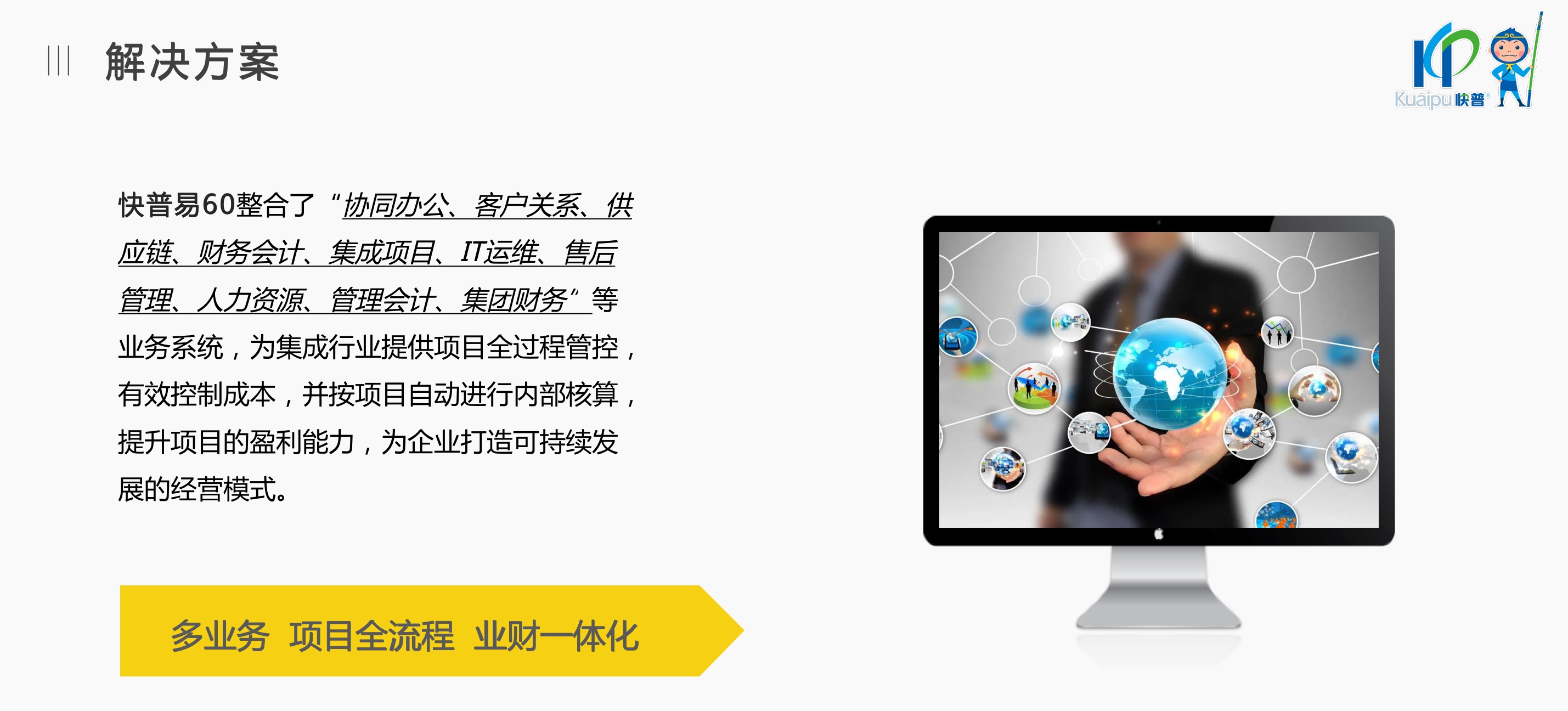 快普易60以客戶為目標(biāo)、以項(xiàng)目為核心,為集成行業(yè)提供數(shù)字化管理解決方案,為組織和業(yè)務(wù)提效,實(shí)現(xiàn)項(xiàng)目全過程管控,有效控制成本,并按項(xiàng)目自動進(jìn)行內(nèi)部核算,提升項(xiàng)目的盈利能力,為企業(yè)打造可持續(xù)發(fā)展的經(jīng)營模式。