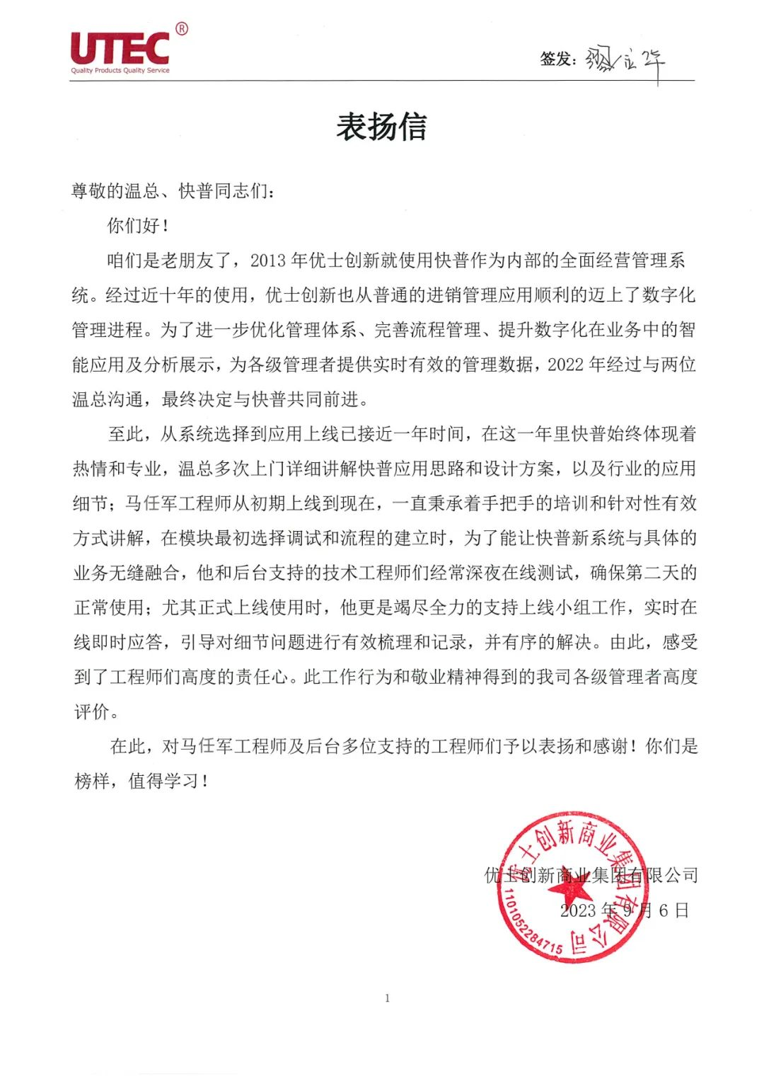 【簡訊】老客戶優(yōu)士創(chuàng)新商業(yè)集團有限公司(以下簡稱“優(yōu)士創(chuàng)新”)向我司發(fā)來感謝信,對快普的平臺、產(chǎn)品和團隊服務給予了高度肯定,并特別對實施工程師馬任軍的專業(yè)、敬業(yè)及高度責心提出了表揚和贊賞。