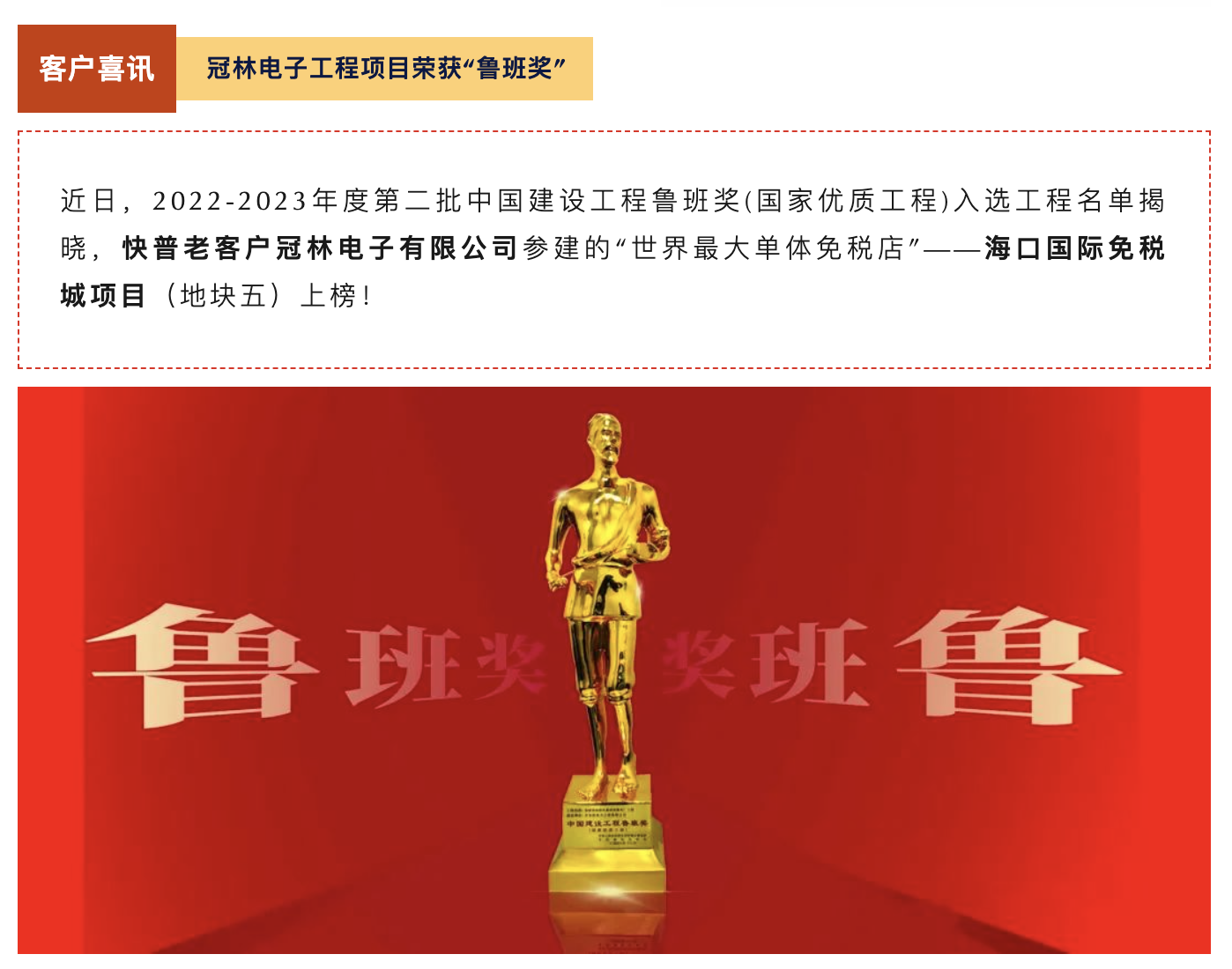 祝賀!快普老客戶冠林電子工程項目榮獲 “魯班獎”