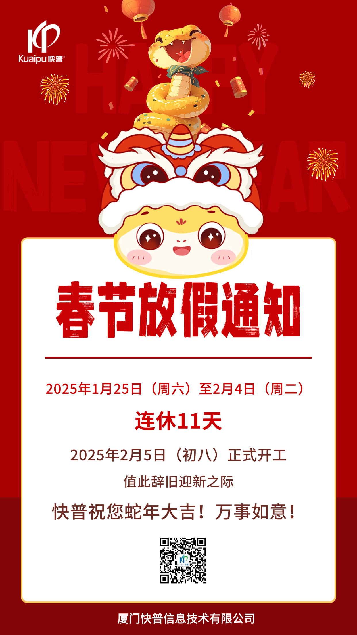 2025年春節(jié)即將到來(lái),快普公司全體員工提前恭??炱沼脩粼谛碌囊荒昀?,生活美美滿滿,事業(yè)紅紅火火,財(cái)源滾滾而來(lái),家庭和和美美,幸福永遠(yuǎn)常在。