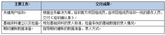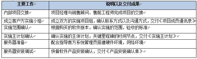 該階段主要是做實(shí)施基礎(chǔ)的搭建,包括完成內(nèi)部交接、確認(rèn)雙方的項(xiàng)目組成員名單、確認(rèn)實(shí)施范圍、確認(rèn)實(shí)施計(jì)劃、服務(wù)器準(zhǔn)備以及軟件部署。該階段結(jié)束以《項(xiàng)目啟動階段里程碑確認(rèn)單》作為交付。