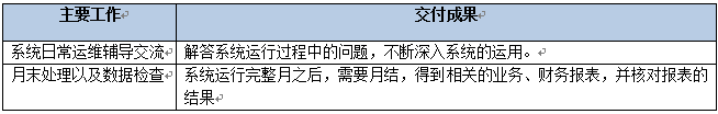 該階段主要是做系統(tǒng)開賬運(yùn)作之后,持續(xù)支持運(yùn)用中出現(xiàn)的所有問題,系統(tǒng)運(yùn)行完整月之后,指導(dǎo)月結(jié),得到相關(guān)的報(bào)表數(shù)據(jù)。該階段結(jié)束以《持續(xù)支持里程碑確認(rèn)單》作為交付。