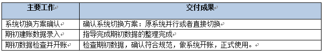 該階段主要是確認(rèn)系統(tǒng)的切換方案,檢查系統(tǒng)啟賬之前的所有準(zhǔn)備的數(shù)據(jù)的情況,確認(rèn)開賬。該階段結(jié)束以《上線切換階段里程碑確認(rèn)單》作為交付。