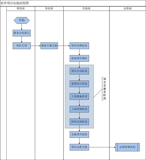 快普軟件項(xiàng)目實(shí)施分為五個(gè)階段:項(xiàng)目啟動階段、藍(lán)圖設(shè)計(jì)階段、上線準(zhǔn)備階段、上線切換階段、持續(xù)支持階段。每個(gè)階段都有對應(yīng)的階段交付成果。完成這五個(gè)階段的任務(wù)之后,進(jìn)入實(shí)施項(xiàng)目驗(yàn)收階段。實(shí)施驗(yàn)收完成之后,轉(zhuǎn)入運(yùn)維部門,實(shí)施過程結(jié)束。